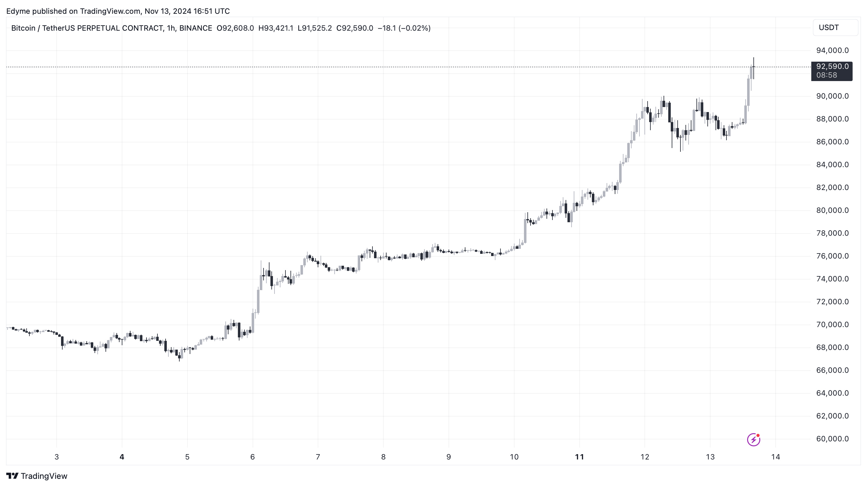 Bitcoin has continued with its sturdy bullish momentum, buying and selling at highs which have by no means earlier than been seen. Right this moment, the asset has achieved a brand new all-time excessive of roughly $93,477. This ATH was achieved not way back following an earlier dip at the moment to $85,000.