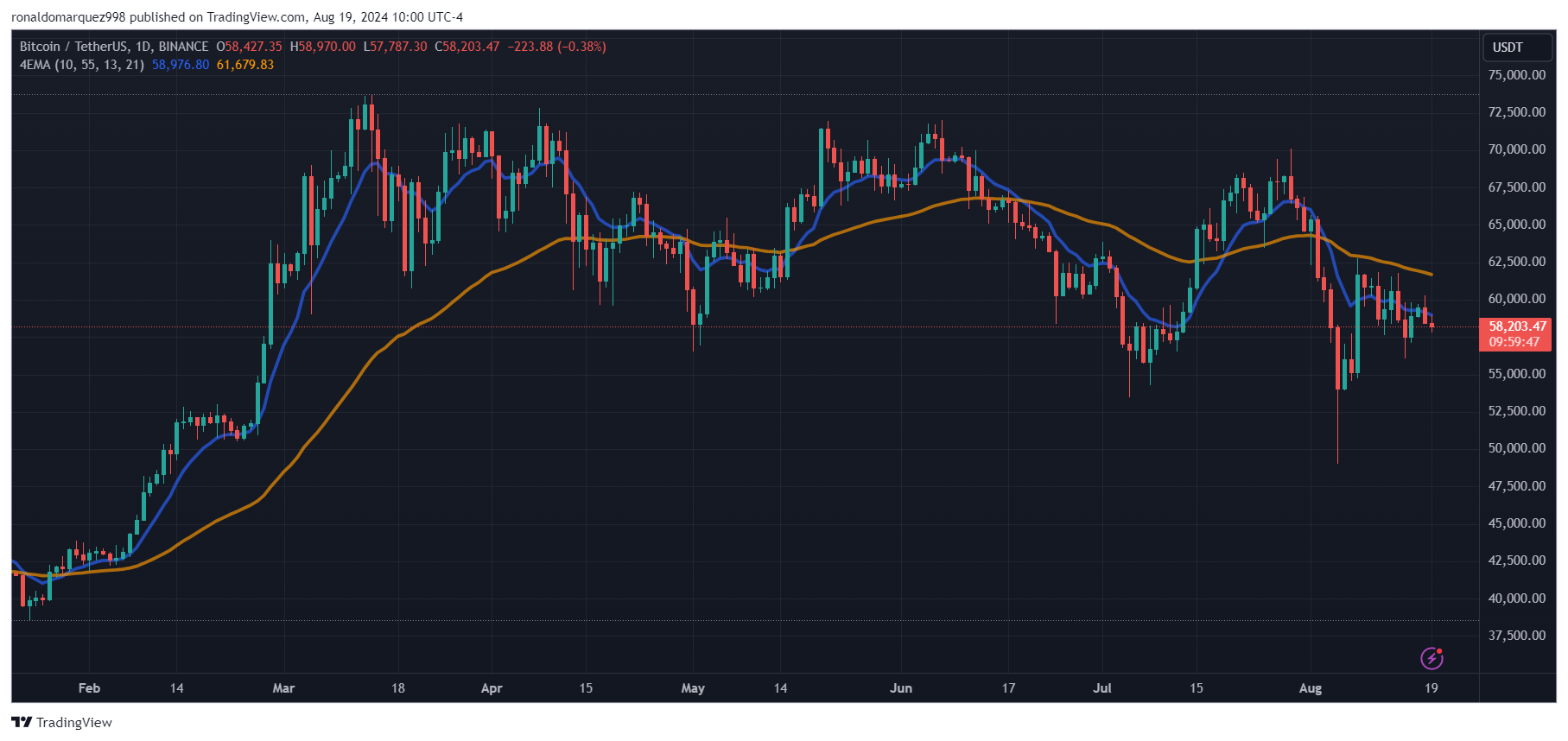 BTC has fallen over 2% within the final 24 hours however discovered assist final week at $56,000, which will probably be essential for bullish buyers to carry in case to forestall a deeper retracement within the coming days and assessments as soon as once more its 7-month low of $49,000 reached on August fifth.