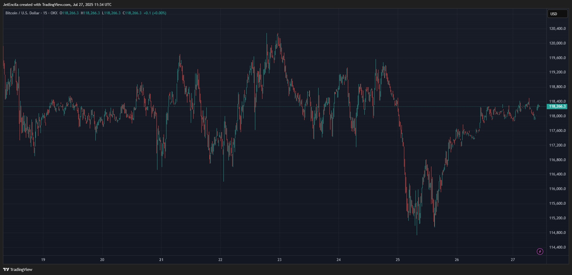 Information of the $9 billion Bitcoin sale initially prompted value volatility. Bitcoin’s value had not too long ago been buying and selling round $119,000, so the sudden inflow of promote orders prompted a short-lived pullback. On July 25, as experiences of Galaxy’s whale sale unfold, BTC/USD swiftly fell to round $114,000 to $115,000.